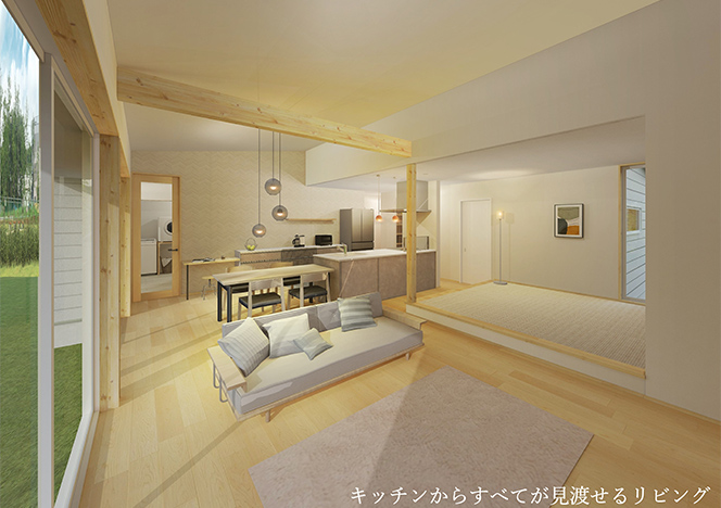 キッチンからリビング・ダイニングまで見渡せる、開放的なLDK。