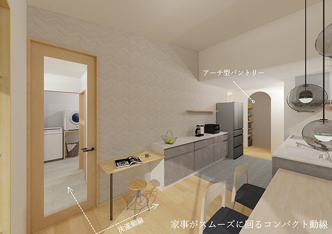 アーチ型パントリーや洗濯動線など、毎日の「使いやすい」が詰まった住まいです。