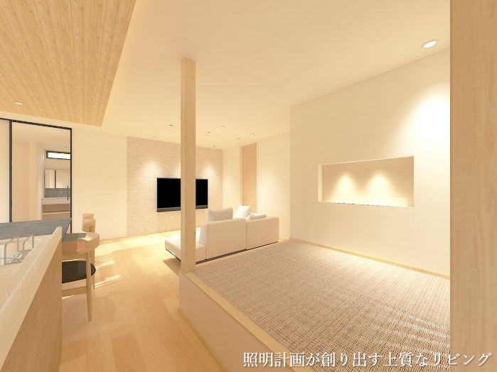 やさしい照明が空間を包み込み、家族の会話や笑顔が自然と広がる、あたたかなリビングに仕上げました。