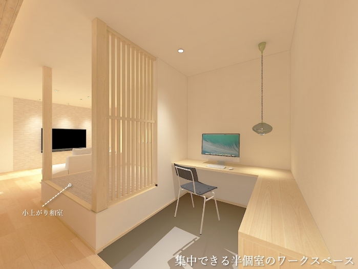 小上がり和室とゆるやかにつながる、半個室のワークスペース。家族の気配を感じながら、心地よく集中できる空間です。